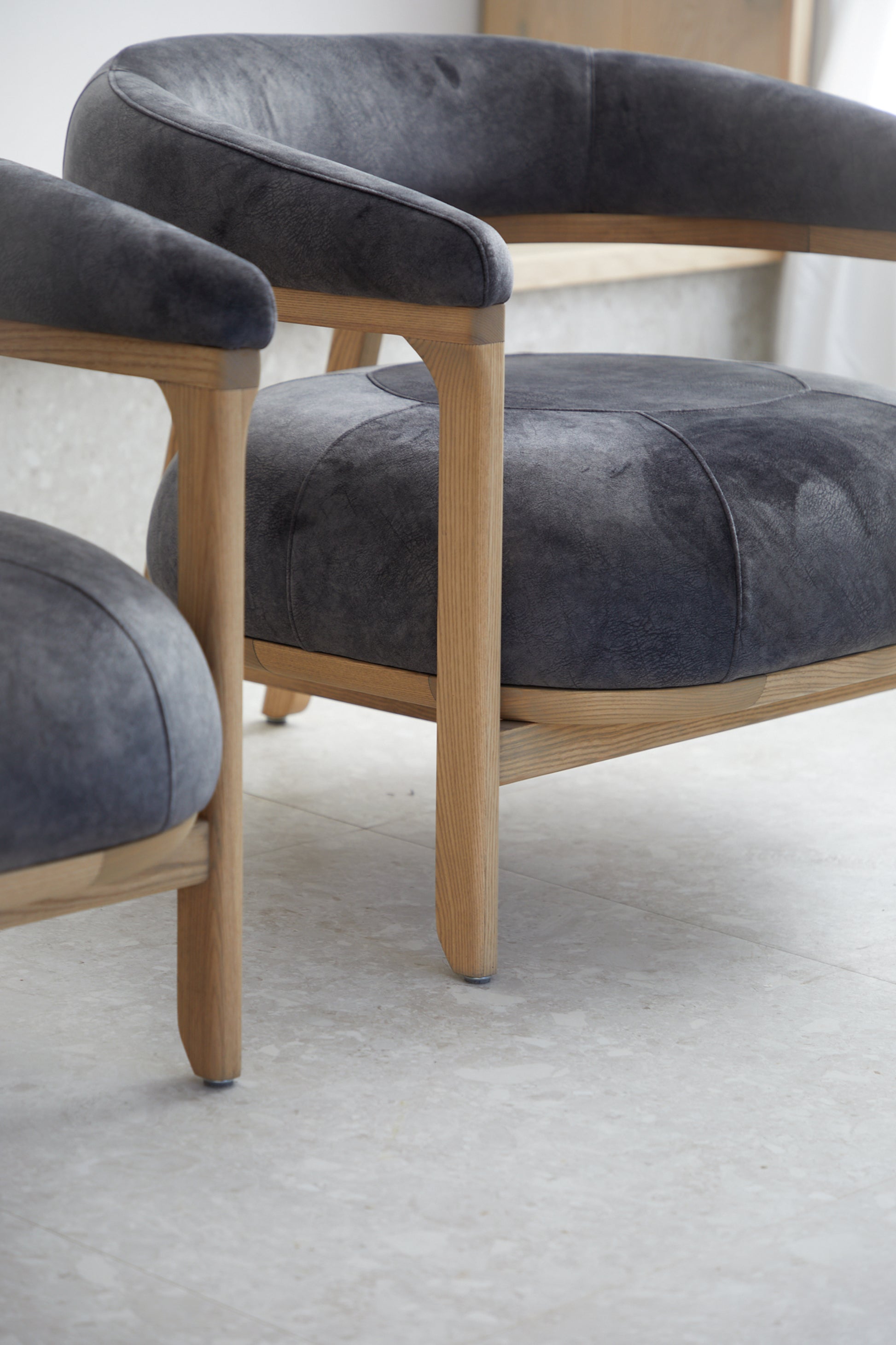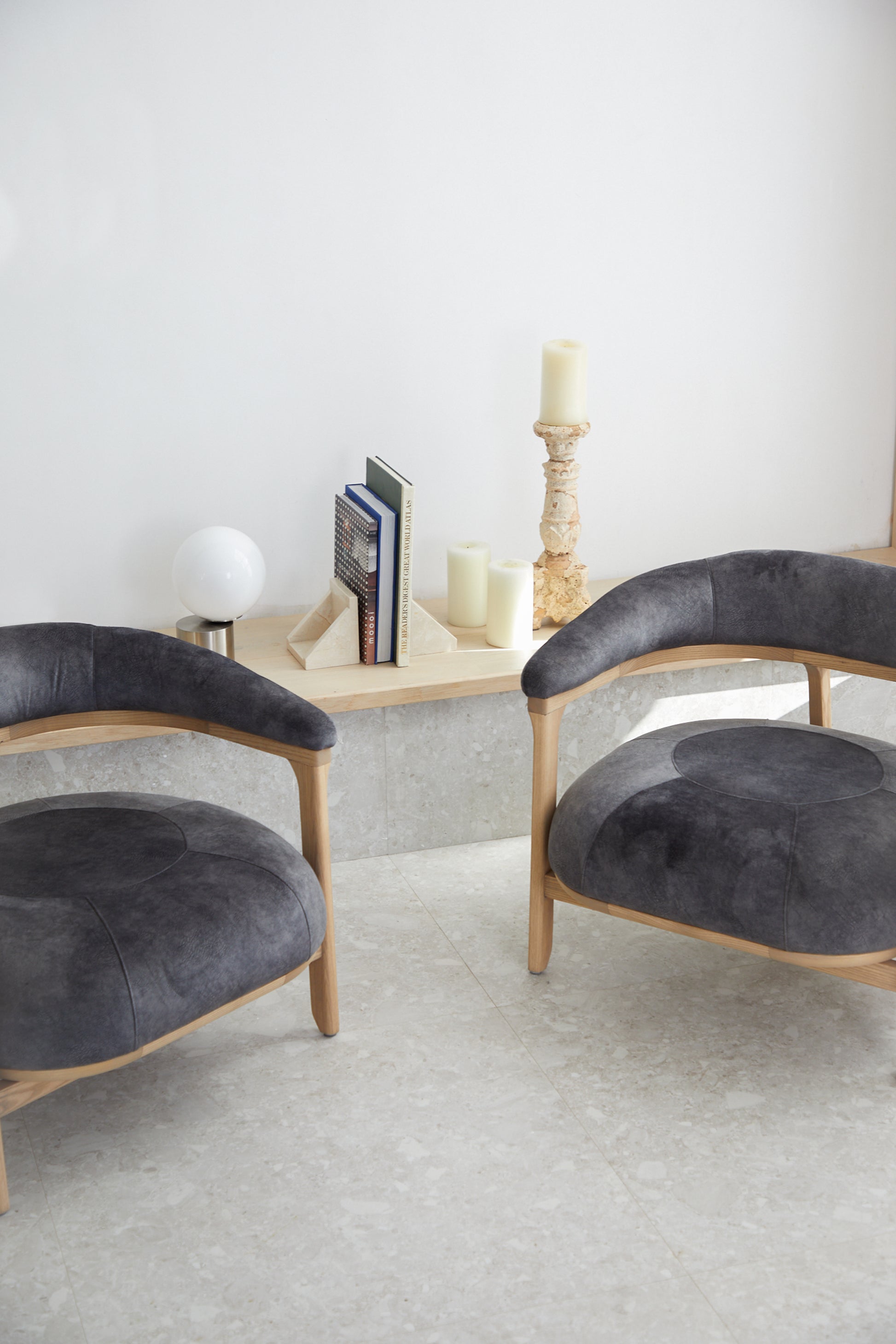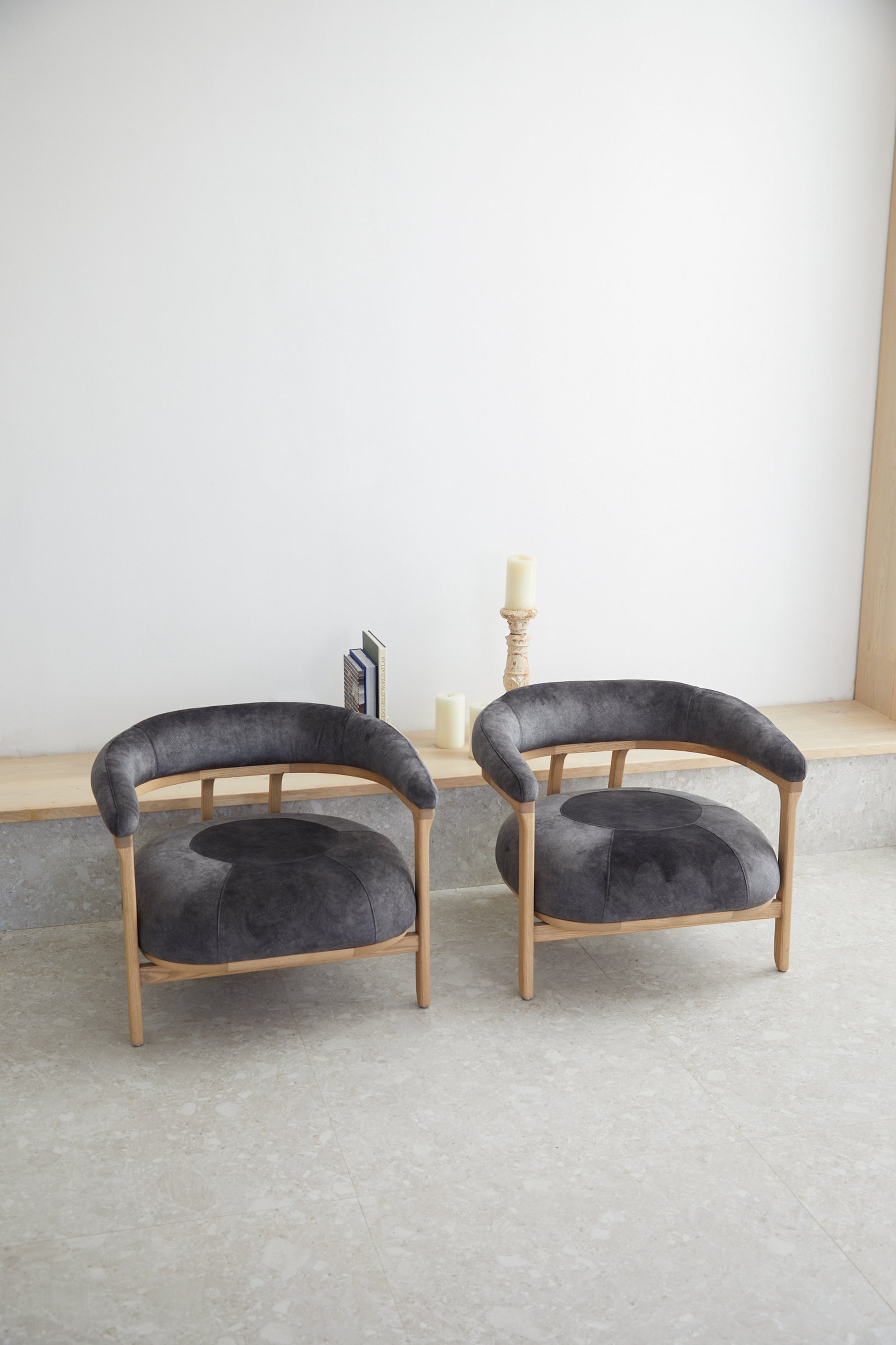 The bubble occasional chair offers soft curves and a sturdy oak base, it is a comfortable contemporary modern occasional chair that refuses to compromise on style or comfort. Showcased in faux leather look velvet upholstery that adds to the chairs soft and welcoming appearance. Curved edges and minimalistic oak base details allow this chair to complement any style of home decor, making it a perfect addition to your home. Custom options available.