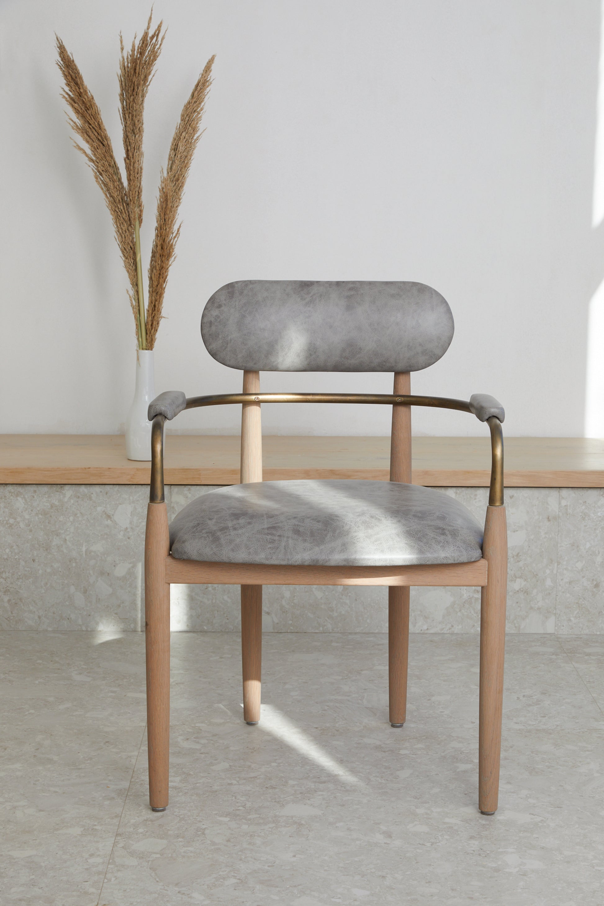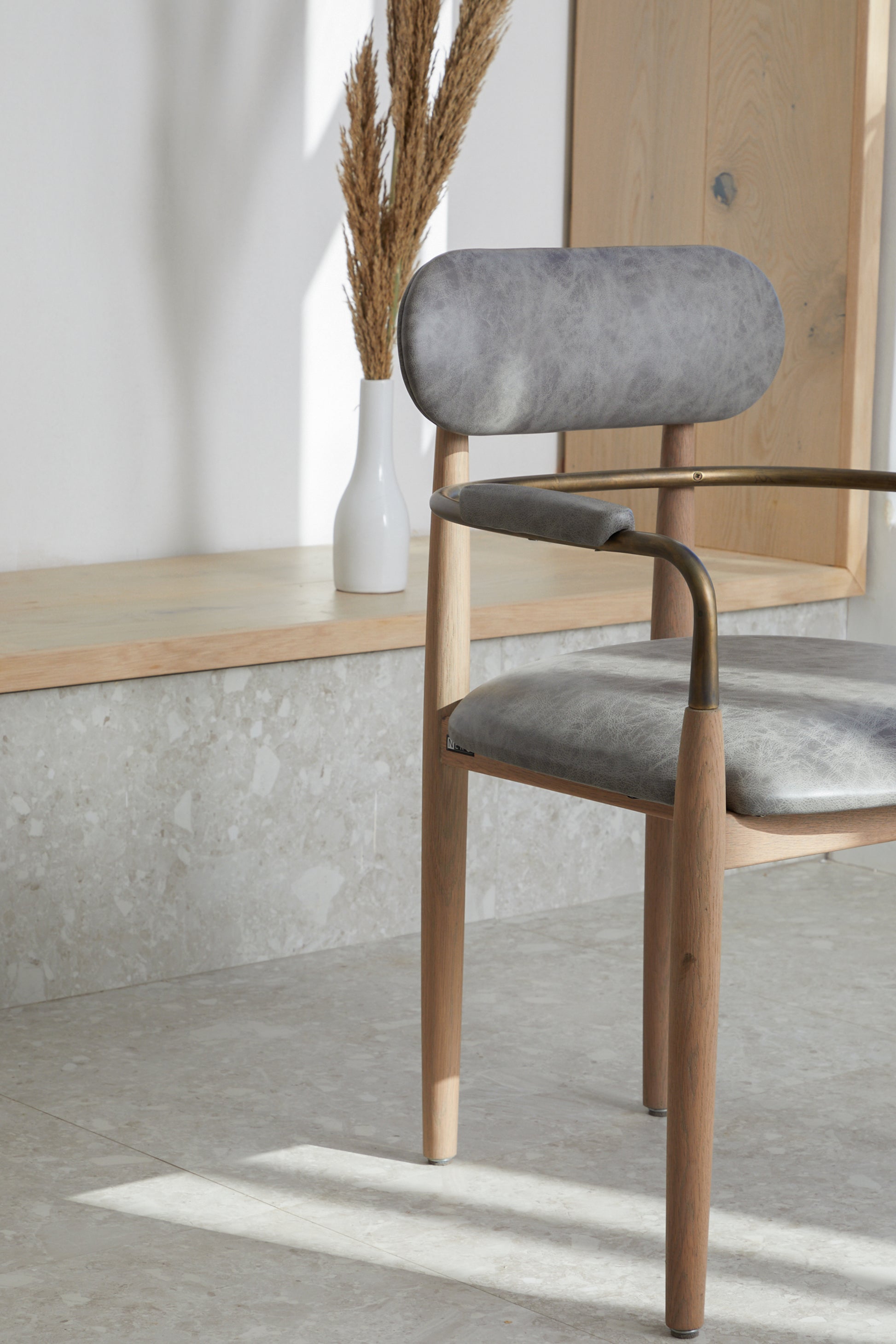 The Fyn Dining Chair is a stylish addition to any dining room with its solid oak base and brass detailing. The chair features a leather upholstered seat and backrest, adding a touch of luxury and sophistication to your dining experience. The sturdy oak base provides a stable foundation, while the brass detailing adds a touch of elegance. The leather upholstery is durable and easy to clean, making it a practical choice for any home. Overall, the Fyn Dining Chair is a perfect choice for those who appreciate high-quality craftsmanship and attention to detail in their furniture.